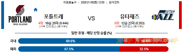 2026-01-06 12:00 NBA 포틀랜드 트레일블레이저 vs 유타 재즈 페이지 정보 작성자 꿀픽 댓글 0건 조회 175회 작성일 26-01-05 21:52 목록 답변 글쓰기 본문 이전글2026-01-06 12:00 NBA LA 클리퍼스 vs 골든스테이트 워리어스 26.01.05 다음글2026-01-06 09:30 NBA 보스턴 셀틱스 vs 시카고 불스 26.01.05 댓글 0 댓글목록 등록된 댓글이 없습니다.