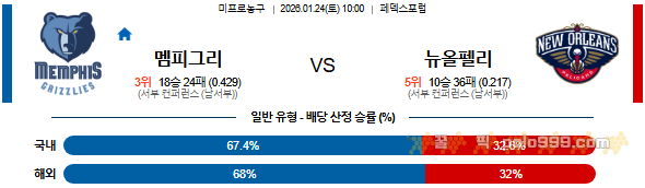2026-01-24 10:00 NBA 멤피스 그리즐리즈 vs 뉴올리언스 펠린컨즈 페이지 정보 작성자 꿀픽 댓글 0건 조회 120회 작성일 26-01-23 21:30 목록 답변 글쓰기 본문 이전글2026-01-24 10:00 NBA 오클라호마시티 썬더 vs 인디애나 페이서스 26.01.23 다음글2026-01-24 14:00 KBL 서울 SK vs 대구 한국가스공사 26.01.23 댓글 0 댓글목록 등록된 댓글이 없습니다.