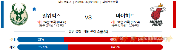 2026-02-25 10:00 NBA 밀워키 벅스 vs 마이애미 히트 페이지 정보 작성자 꿀픽 댓글 0건 조회 190회 작성일 26-02-25 01:55 목록 답변 글쓰기 본문 이전글2026-02-25 09:30 NBA 토론토 랩터스 vs 오클라호마시티 썬더 26.02.25 다음글2026-02-25 11:00 NBA 피닉스 선즈 vs 보스턴 셀틱스 26.02.25 댓글 0 댓글목록 등록된 댓글이 없습니다.