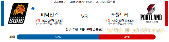 2026-04-15 11:00 NBA 피닉스 선즈 vs 포틀랜드 트레일블레이저 페이지 정보 작성자 꿀픽 댓글 0건 조회 140회 작성일 26-04-15 18:23 목록 답변 글쓰기 본문 이전글2026-04-16 08:30 NBA 필라델피아 76ERS vs 올랜도 매직 26.04.15 다음글2026-04-15 08:30 NBA 샬럿 호네츠 vs 마이애미 히트 26.04.15 댓글 0 댓글목록 등록된 댓글이 없습니다.