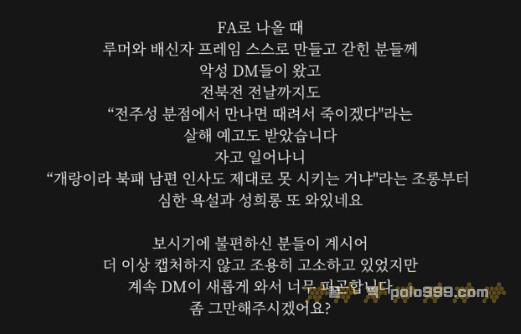 곽민선을 향한 악플과 협박은 송민규가 지난해까지 뛰었던 전북을 떠나 서울로 이적한 이후 본격화됐다. 곽민선은 지난 1월에도 "남편이 짊어지고 간다고 괜찮다고 했는데 저는 안 괜찮다"며 받은 DM을 공개한 바 있다. 당시 공개된 DM에는 ‘서울 가서 꼭 XX되세요‘, ‘상암에서 뒤통수 조심해라 빠따로 쳐서 죽여버린다‘ 등 선을 넘는 내용이 포함됐다.
