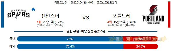 2026-01-04 10:00 NBA 샌안토니오 스퍼스 vs 포틀랜드 트레일블레이저 페이지 정보 작성자 꿀픽 댓글 0건 조회 296회 작성일 26-01-04 04:16 목록 답변 글쓰기 본문 이전글2026-01-05 08:00 NBA 마이애미 히트 vs 뉴올리언스 펠린컨즈 26.01.04 다음글2026-01-04 12:00 NBA 골든스테이트 워리어스 vs 유타 재즈 26.01.04 댓글 0 댓글목록 등록된 댓글이 없습니다.