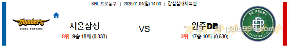 2026-01-04 14:00 KBL 컵 서울 삼성 vs 원주 DB 페이지 정보 작성자 꿀픽 댓글 0건 조회 284회 작성일 26-01-05 00:15 목록 답변 글쓰기 본문 이전글2026-01-05 19:00 KBL 컵 대구 한국가스공사 vs 고양 소노 26.01.05 다음글2026-01-05 11:30 NBA LA 레이커스 vs 멤피스 그리즐리즈 26.01.04 댓글 0 댓글목록 등록된 댓글이 없습니다.