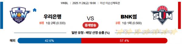 우리은행은 직전 경기에서 신한은행을 크게 잡으며 분위기 전환에 성공했지만, 여전히 득점 편중과 외곽 기복이 뚜렷해 안정감이 떨어진다. 김단비 중심 전술이 강하게 드러나 상대의 집중 견제를 받을 가능성도 높다. 반면, BNK 썸은 KB스타즈전 패배에도 불구하고 안혜지, 박혜진, 이소희의 백코트 조합이 꾸준한 생산력을 유지하고 있으며, 개막전에서 보여준 조직적인 수비와 리바운드 참여가 인상적이었다. 우리은행의 가드 부재가 확실하게 드러나며 흐름을 빼앗길 위험성이 높은 상대가 BNK 썸 이라고 생각된다.