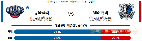 2026-03-17 09:00 NBA 뉴올리언스 펠린컨즈 vs 댈러스 매버릭스 페이지 정보 작성자 꿀픽 댓글 0건 조회 128회 작성일 26-03-16 21:48 목록 답변 글쓰기 본문 이전글2026-03-17 11:00 NBA LA 클리퍼스 vs 샌안토니오 스퍼스 26.03.16 다음글2026-03-17 09:00 NBA 시카고 불스 vs 멤피스 그리즐리즈 26.03.16 댓글 0 댓글목록 등록된 댓글이 없습니다.