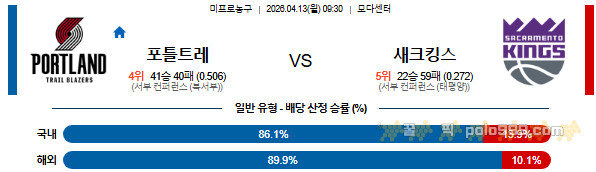 2026-04-13 09:30 NBA 포틀랜드 트레일블레이저 vs 새크라멘토 킹스 페이지 정보 작성자 꿀픽 댓글 0건 조회 162회 작성일 26-04-12 19:07 목록 답변 글쓰기 본문 이전글026-04-13 07:00 NBA 마이애미 히트 vs 애틀랜타 호크스 26.04.12 다음글2026-04-12 14:00 KBL 서울 SK vs 고양 소노 26.04.11 댓글 0 댓글목록 등록된 댓글이 없습니다.