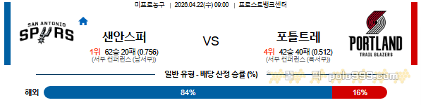 2026-04-22 09:00 NBA 샌안토니오 스퍼스 vs 포틀랜드 트레일블레이저 페이지 정보 작성자 꿀픽 댓글 0건 조회 291회 작성일 26-04-21 21:05 목록 답변 글쓰기 본문 이전글2026-04-23 08:00 NBA 디트로이트 피스톤스 vs 올랜도 매직 26.04.22 다음글2026-04-22 19:00 WKBL KB스타즈 vs 삼성생명 26.04.21 댓글 0 댓글목록 등록된 댓글이 없습니다.