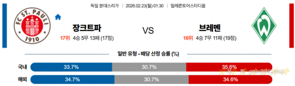 2602-02-23 01:30 분데스리가 FC 장크트파울리 SV 베르더 브레멘 > 축구픽게시판
