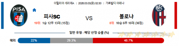 2026-03-03 02:30 세리에 A 피사SC VS 볼로냐 FC