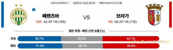 2026-03-13 05:00 UEFA 유로파리그 페렌츠바로시 TC SC 브라가