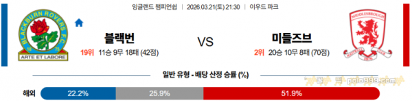 2026-03-21 21:30 잉글랜드 챔피언쉽 블랙번 로버스 미들즈브러 FC