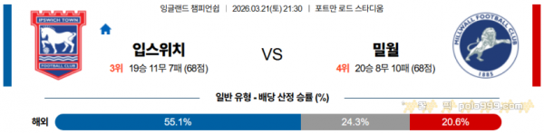 2026-03-21 21:30 잉글랜드 챔피언쉽 입스위치 타운 밀월 FC