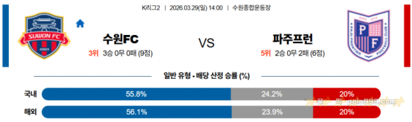 재충전의 시간을 보낸 수원FC는 개막 3연승 흐름 속에서 수비 조직과 빠른 전환 공격이 안정적으로 자리 잡았고 마테우스 프리조(FW 3득점2도움)를 중심으로 한 공격 완성도가 높아지며 경기 막판 집중력까지 유지되고 있다, 또한 양한빈(GK)의 안정감과 한찬희(MF)의 빌드업 연결이 흐름을 끌어올리고 있다. 반면, 파주프런티어FC는 2연승으로 상승세를 보이고 있지만 신생팀 특성상 수비 조직 완성도에서 기복이 나타나고 있고 원정에서는 경기 흐름 유지에 어려움을 보일 가능성이 있다, 특히 수원FC의 빠른 역습 대응에서 부담이 클 수 있다. 수원FC 우세가 예상된다..