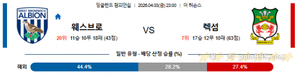 2026-04-03 23:00 잉글랜드 챔피언쉽 웨스트 브로미치 vs 앨비언 렉섬 > 축구픽게시판