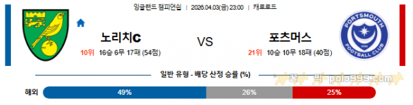 2026-04-03 23:00 잉글랜드 챔피언쉽 노리치 시티 FC vs 포츠머스 FC