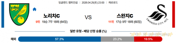 2026-04-25 23:00 잉글랜드 챔피언쉽 노리치 시티 FC 스완지 시티