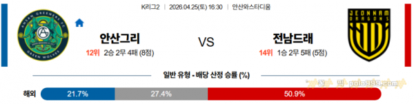 2026-04-25 16:30 K리그 2 안산 그리너스 FC 전남 드래곤즈 > 축구픽게시판