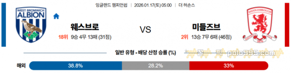 2026-01-17 05:00 잉글랜드 챔피언쉽 웨스트 브로미치 앨비언 미들즈브러 FC > 축구픽게시판