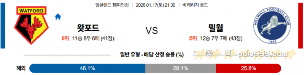 2026-01-17 21:30 잉글랜드 챔피언쉽 왓포드 밀월 FC > 축구픽게시판