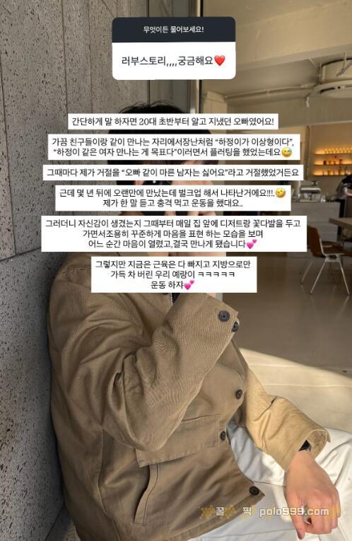 그는 “20대 초반부터 알고 지냈던 오빠다. 가끔 친구들이랑 같이 만나는 자리에서 장난처럼 ‘하정이가 이상형’이러면서 플러팅을 했었는데 그때마다 제가 ‘오빠 같이 마른 남자는 싫다’고 거절했었다”고 밝혔다.