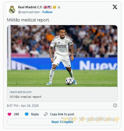 "수술은 레알 마드리드의 의학 서비스 감독하에 라세 렘페이넨 박사에 의해 진행되었습니다. 밀리타오는 가까운 시일 내에 회복 작업을 시작할 예정입니다."