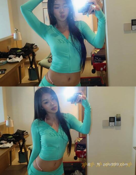 까무잡잡한 피부 색에 잘 어울리는 민트 컬러 옷에 핑크 색 속옷 끈이 살짝 보이는 스타일로 핫한 매력을 자랑했다.