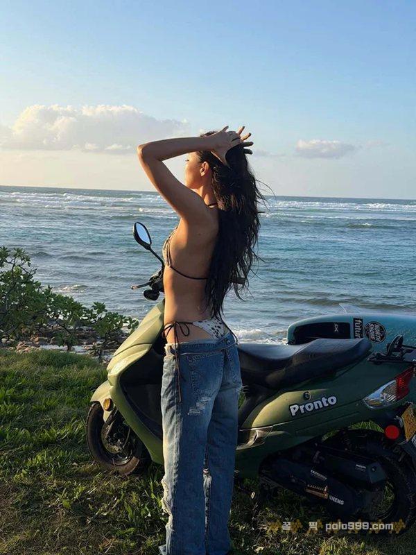 공개된 사진 속 제니는 해변을 배경으로 비키니와 데님 팬츠를 매치한 스타일링으로 여유로운 분위기를 자아낸다.