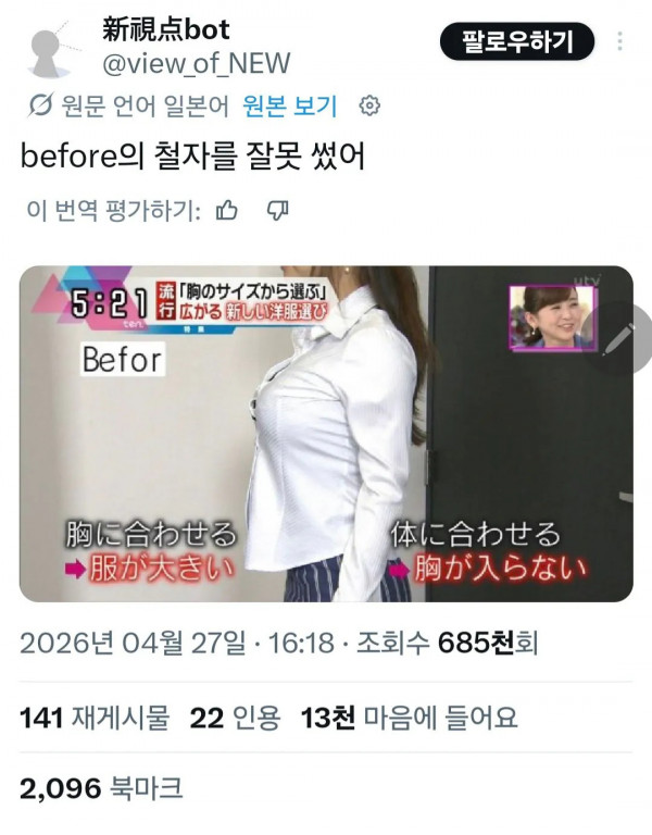 ㅇㅎ) 영어 스펠링 틀린 일본 방송 페이지 정보 작성자 안구정화 작성일 26-04-29 05:37 조회 183 댓글 0 본문 ㅇㅎ) 영어 스펠링 틀린 일본 방송 이전글 아이돌과 AV 여배우의 공통점 다음글 13 댓글목록 0 등록된 댓글이 없습니다.