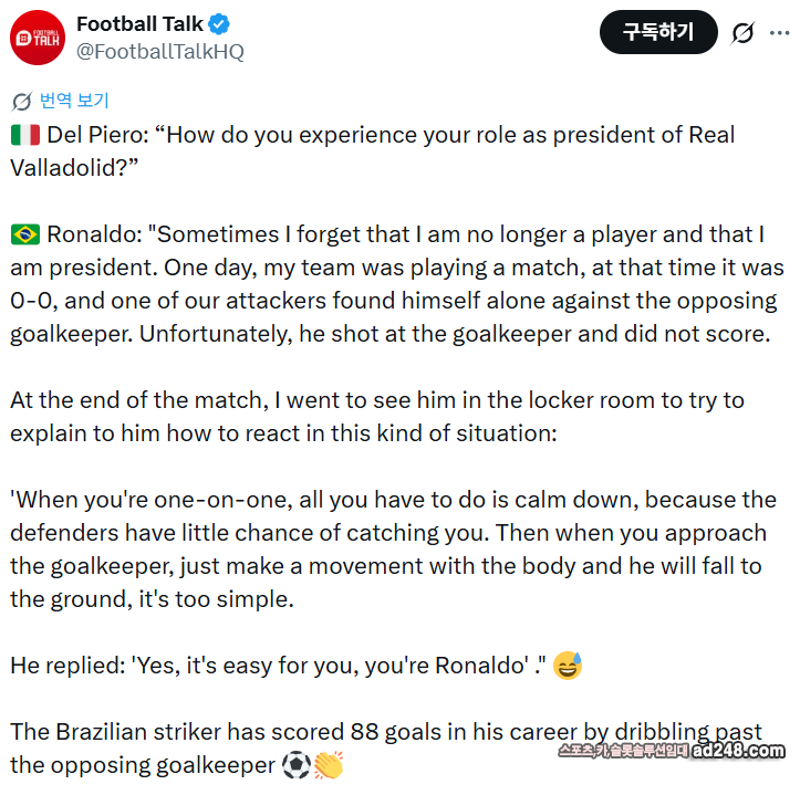 델 피에로: "레알 바야돌리드의 회장으로서의 삶은 어떤가요?"호나우두: "가끔은 제가 더 이상 선수가 아니라 회장이라는 ..