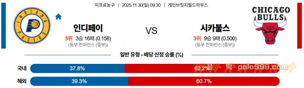 인디애나는 시아캄과 마서린의 활약에도 할리버튼과 토핀의 공백이 커 경기 기복이 여전하다. 홈에서 3승6패로 안정감이 부족하고 연속경기 일정까지 겹쳐 체력 관리에서도 불리하다. 반면, 시카고는 2연패지만 조시 기디와 코비 화이트의 득점 생산은 꾸준하며 부체비치의 골밑 경쟁력도 여전히 유효하다. 3점 효율만 정상화된다면 경기 운영 주도권을 가져갈 가능성이 높다.