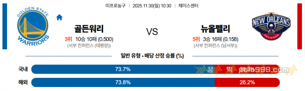 골든스테이트 승리가 예상된다. 다만, 커리의 이탈은 핸디캡 승부에서 뉴올리언즈에게 큰 기회를 부여한다.