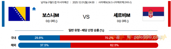 세르비아는 월드컵과 유럽대회에서 검증된 선수층의 기술력과 경기 운영 능력을 스위스와 경기에서 보여줬다. 승부처에 세르비아 농구의 단단함이 나타날 것이며 보스니아가 홈에서는 완전한 속공 상황이 아니면 가 템포 바스켓을 구사할 것으로 예상되는 만큼 언더 경기다.