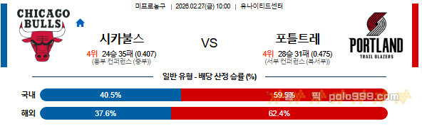 2026-02-27 10:00 NBA 시카고 불스 vs 포틀랜드 트레일블레이저 페이지 정보 작성자 꿀픽 댓글 0건 조회 182회 작성일 26-02-27 10:24 목록 답변 글쓰기 본문 이전글2026-02-27 19:00 WKBL 삼성생명 vs 신한은행 26.02.27 다음글2026-02-27 11:00 NBA 유타 재즈 vs 뉴올리언스 펠린컨즈 26.02.27 댓글 0 댓글목록 등록된 댓글이 없습니다.