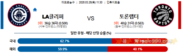 2026-03-26 11:30 NBA LA 클리퍼스 vs 토론토 랩터스 페이지 정보 작성자 꿀픽 작성일 26-03-25 19:44 조회 312 댓글 0 본문 이전글 2026-03-26 10:00 NBA 유타 재즈 vs 워싱턴 위자드 다음글 2026-03-26 11:00 NBA 덴버 너겟츠 vs 댈러스 매버릭스 댓글목록 0 등록된 댓글이 없습니다.