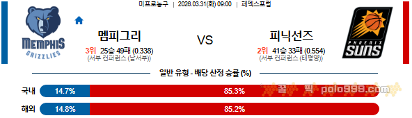 2026-03-31 09:00 NBA 멤피스 그리즐리즈 vs 피닉스 선즈 페이지 정보 작성자 꿀픽 댓글 0건 조회 279회 작성일 26-03-30 22:37 목록 답변 글쓰기 본문 이전글2026-03-31 08:30 NBA 애틀랜타 호크스 vs 보스턴 셀틱스 26.03.31 다음글2026-03-31 09:00 NBA 샌안토니오 스퍼스 vs 시카고 불스 26.03.30 댓글 0 댓글목록 등록된 댓글이 없습니다.