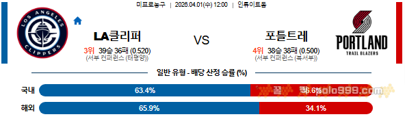 2026-04-01 12:00 NBA LA 클리퍼스 vs 포틀랜드 트레일블레이저 페이지 정보 작성자 꿀픽 댓글 0건 조회 145회 작성일 26-03-31 22:19 목록 답변 글쓰기 본문 이전글2026-04-01 11:30 NBA LA 레이커스 vs 클리블랜드 캐벌리어스 26.03.31 다음글2026-03-31 08:00 NBA 마이애미 히트 vs 필라델피아 76ERS 26.03.31 댓글 0 댓글목록 등록된 댓글이 없습니다.