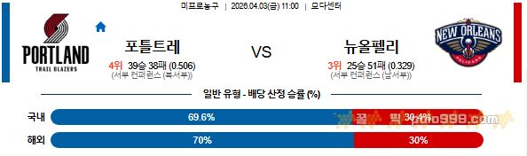 2026-04-03 11:00 NBA 포틀랜드 트레일블레이저 vs 뉴올리언스 페이지 정보 작성자 꿀픽 댓글 0건 조회 147회 작성일 26-04-02 18:30 목록 답변 글쓰기 본문 이전글2026-04-03 10:30 NBA 오클라호마시티 썬더 vs LA 레이커스 26.04.02 다음글2026-04-03 08:00 NBA 샬럿 호네츠 vs 피닉스 선즈 26.04.02 댓글 0 댓글목록 등록된 댓글이 없습니다.