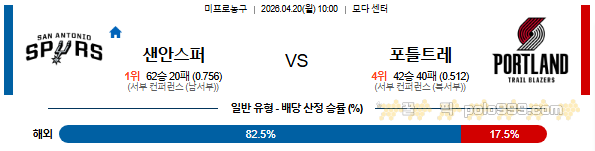 2026-04-20 10:00 NBA 샌안토니오 스퍼스 vs 포틀랜드 트레일블레이저 페이지 정보 작성자 꿀픽 댓글 0건 조회 294회 작성일 26-04-20 11:22 목록 답변 글쓰기 본문 이전글2026-04-20 02:00 NBA 보스턴 셀틱스 vs 필라델피아 76ERS 26.04.20 다음글2026-04-19 09:30 NBA LA레이커스 vs 휴스턴 로켓츠 26.04.19 댓글 0 댓글목록 등록된 댓글이 없습니다.