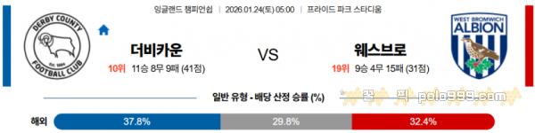 이번 경기는 밸런스를 유지하며 시즌 36득점을 기록 중인 더비카운티와, 38실점이라는 수치로 수비 불안을 그대로 드러내고 있는 웨스트브로미치의 구조적 대비가 핵심이다.