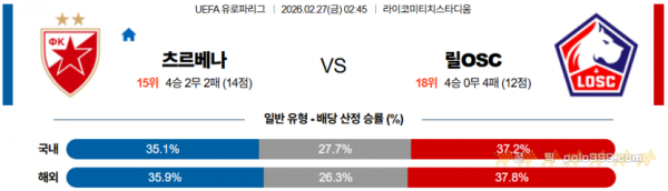 2026-02-27 02:45 UEFA 유로파리그 츠르베나 즈베즈다 릴 OSC > 축구픽게시판