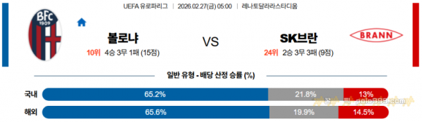 2026-02-27 05:00 UEFA 유로파리그 볼로냐 FC SK 브란