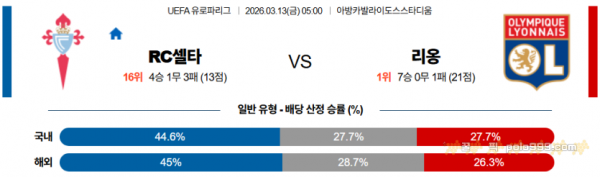 2026-03-13 05:00 UEFA 유로파리그 셀타 비고 올랭피크 리옹 > 축구픽게시판