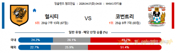 2026-04-07 04:00 잉글랜드 챔피언쉽 헐 시티 AFC vs 코번트리 시티 > 축구픽게시판