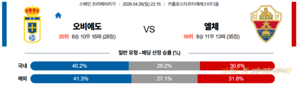 결국 이 경기는 오비에도가 중앙 장악과 전진 드리블의 완성도로 엘체 수비를 계속 흔들 가능성이 높다.