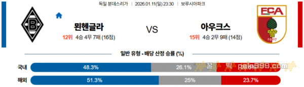 2026-01-11 23:30 분데스리가 묀헨글라트바흐 아우크스부르크