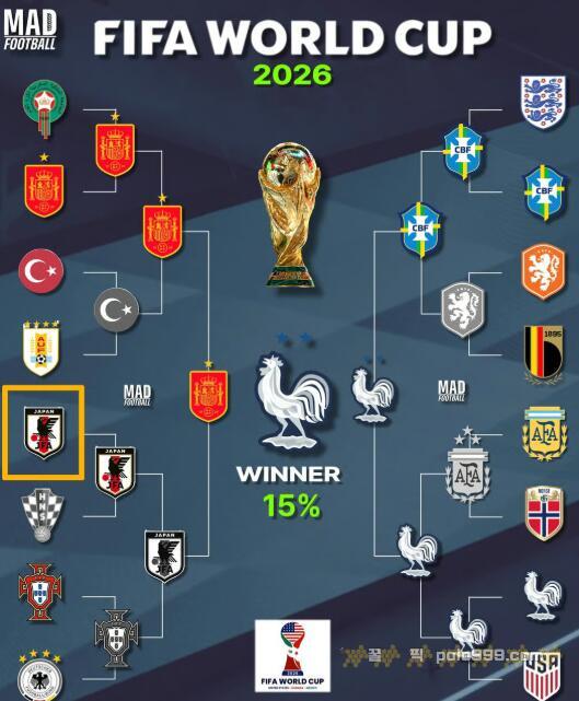 축구 콘텐츠 매체 매드풋볼이 7일(한국시간) AI 기반 2026 북중미 월드컵 예측을 통해 일본이 사상 첫 4강에 오를 것이라고 전망했다. 매체는 "일본이 크로아티아(16강)와 포르투갈(8강)을 꺾고 4강에서 스페인에 패할 것"이라며, 스페인이 결승에서 프랑스를 제압하고 우승할 것으로 예측했다.