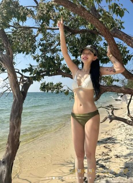 공개된 사진에는 해변에서 휴가를 즐기고 있는 지민의 모습이 담겨 있었다. 지민은 카키색과 흰색을 매치한 비키니를 입고 나무 위에 오르면서 장난기 넘치는 모습을 보여줬다. 긴생머리 스타일에 모자를 더해 센스 있는 비키니 패션을 완성했다.