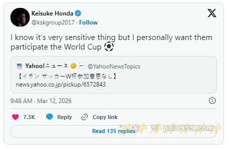 "이것은 매우 민감한 문제인 것을 알지만, 개인적으로 이란이 월드컵에 참가하기를 원합니다." 혼다 케이스케는 16일 트윗에서 이같이 밝혔다. 이는 이란의 스포츠 장관이 "미국과 이스라엘의 전쟁으로 이란 최고 지도자가 사망하면서, 이란은 월드컵에 참가할 수 없다"고 발표한 직후였다.
