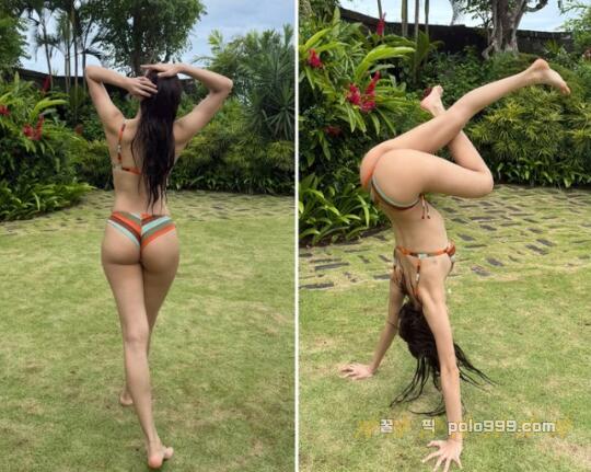 특히 줄무늬 비키니를 입고 찍은 사진은 아무 지지할 것도 없이 두 손으로 물구나무를 서고 있는 모습으로 건강미를 자랑했다.