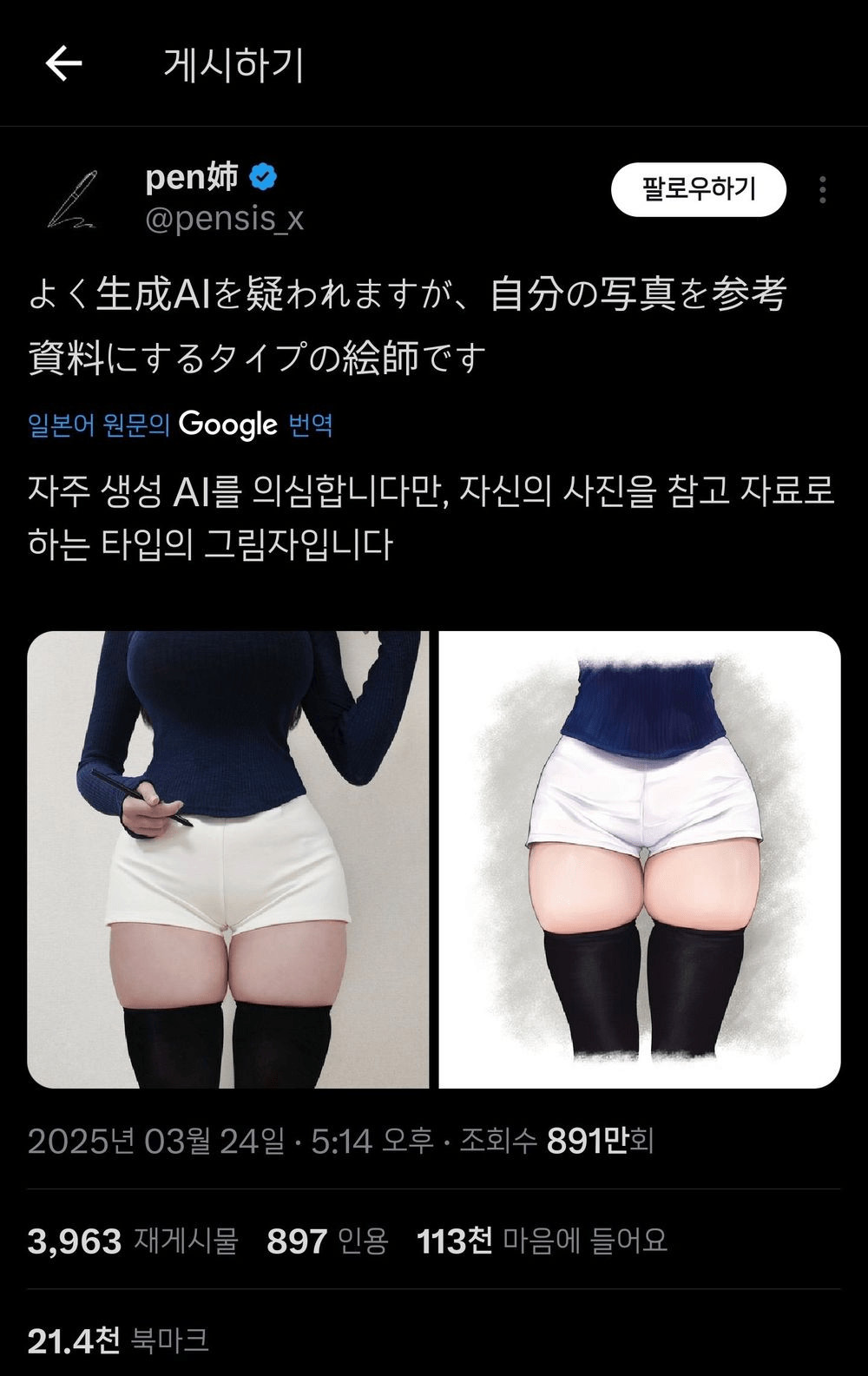ai로 그린다고 의심 받은 여자 작가의 해명 방법 페이지 정보 작성자 안구정화 댓글 0건 조회 227회 작성일 26-04-01 21:01 목록 본문 ai로 그린다고 의심 받은 여자 작가의 해명 방법 이전글9 26.04.01 다음글이분 남편은 도대체 뭐하는 분일까 궁금 26.04.01 댓글 0 댓글목록 등록된 댓글이 없습니다.